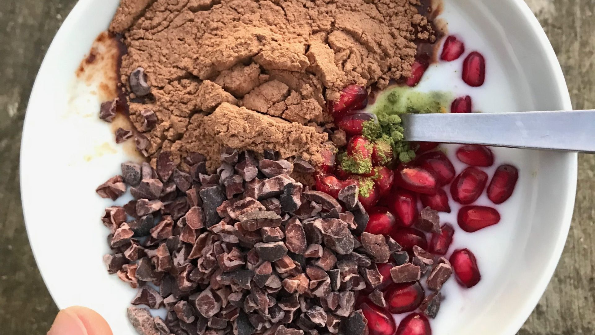 Place the yogurt in a bowl, add the matcha powder, cocoa powder, cocoa nibs, and pomegranate segments. And enjoy!