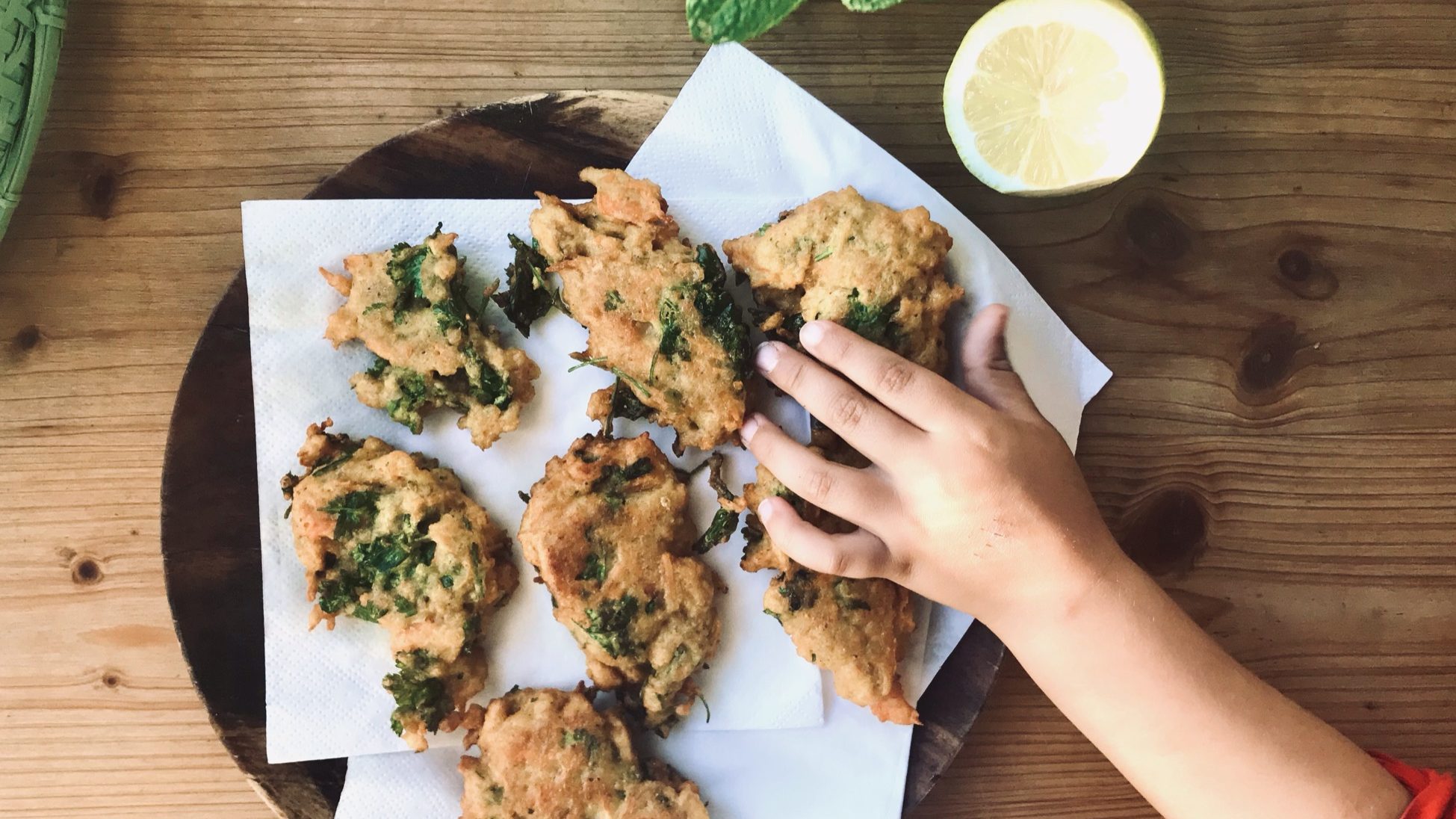 Corta os legumes e ervas aromáticas e coloca numa taça. Adiciona a farinha de grão-de-bico, a água e os condimentos e mistura.