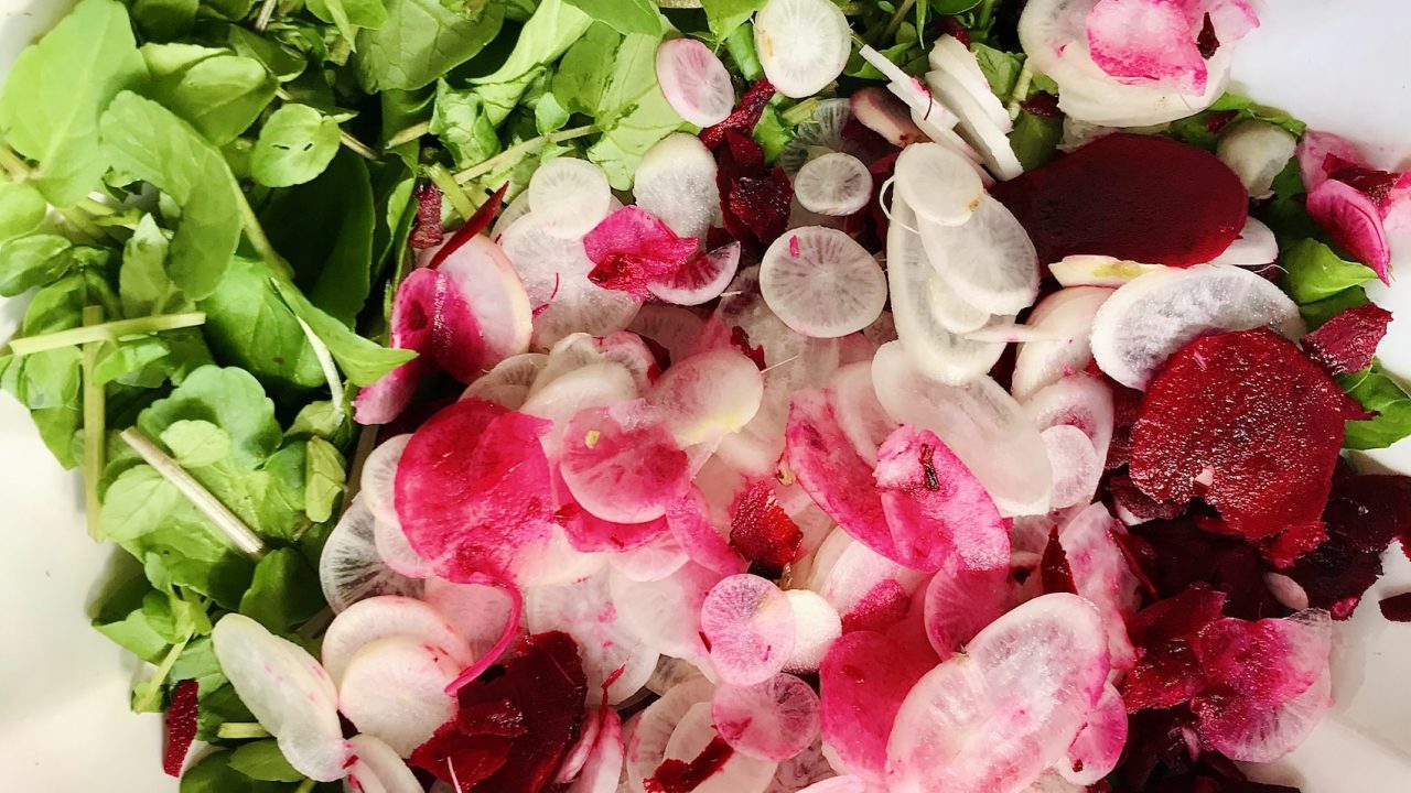 Laminar os rabanetes com um mandolim (bem fininho) assim como as beterrabas e juntar à saladeira.